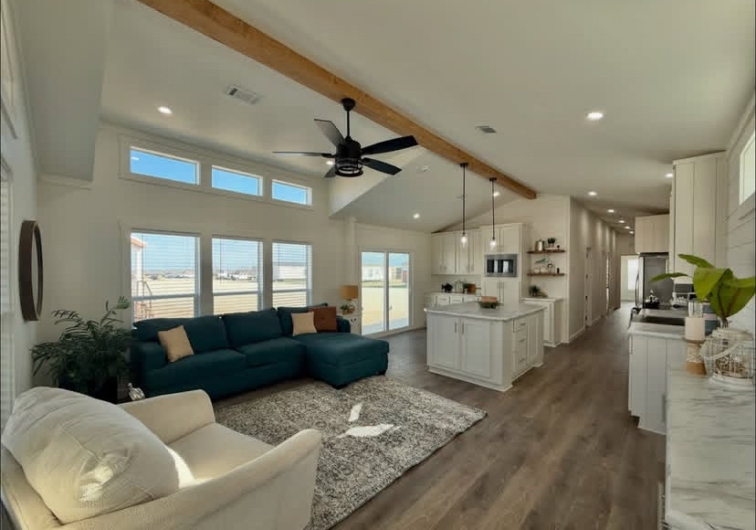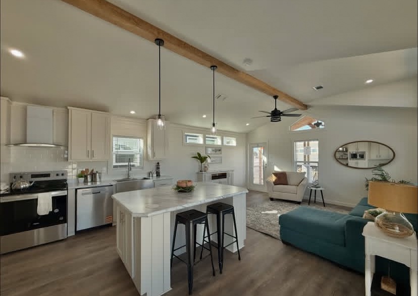 This not so tiny home boasts a large island and a gorgeous beam in the main living area.
