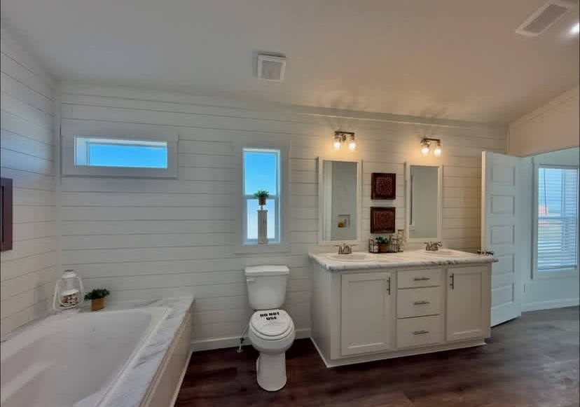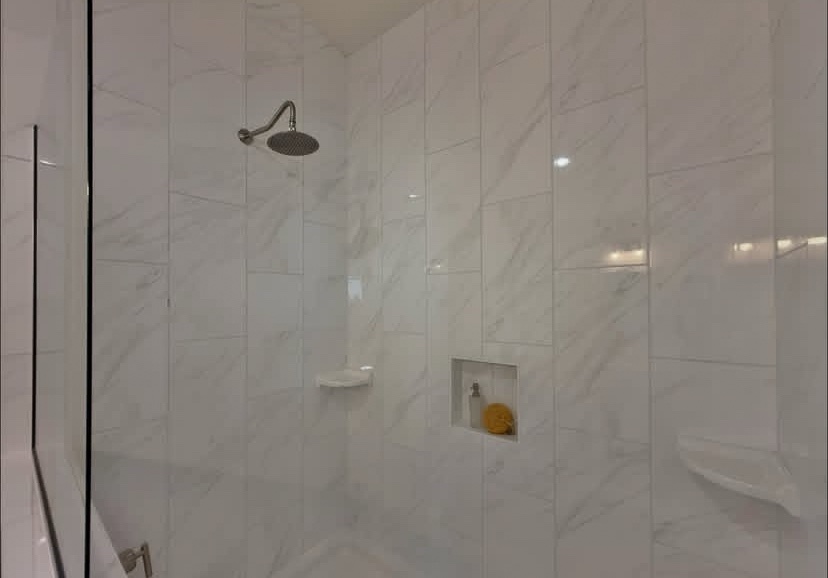 The large bathroom has a beautiful, large tile shower with a separate soaking bathtub.